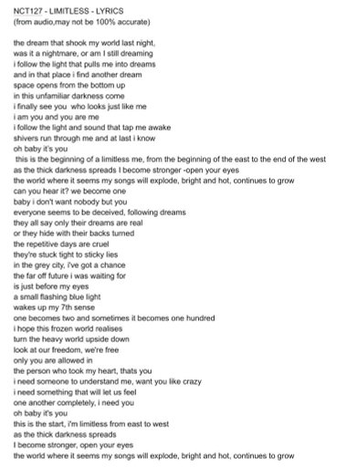 Get all the lyrics to songs on NCT 127 - LIMITLESS English Translation and join the Genius community of music scholars to learn the meaning behind the lyrics.
