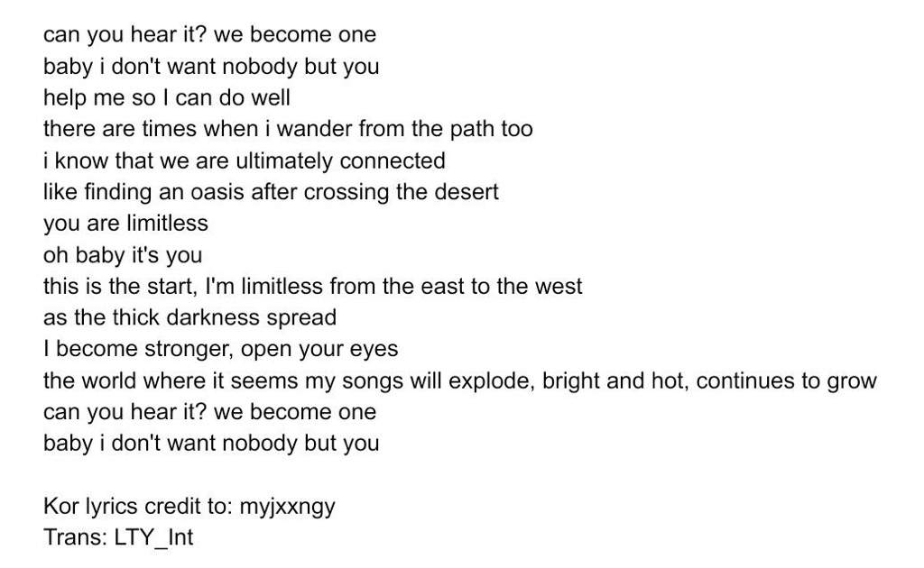 Your existence is limitless. We have become one Baby I dont want nobody but you. Oh baby its you Its only the beginning the limitless me From the start of the East to the end of the West The light gets stronger As it spreads through the darkness Open your eyes My song is getting louder Did you see. No Copyright Infringment Intended.